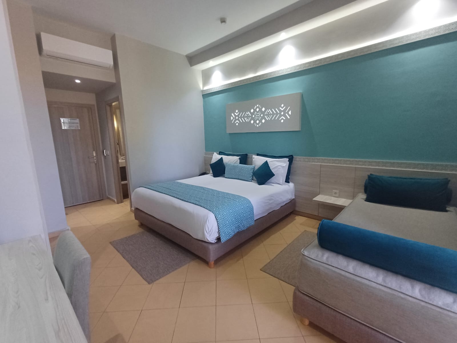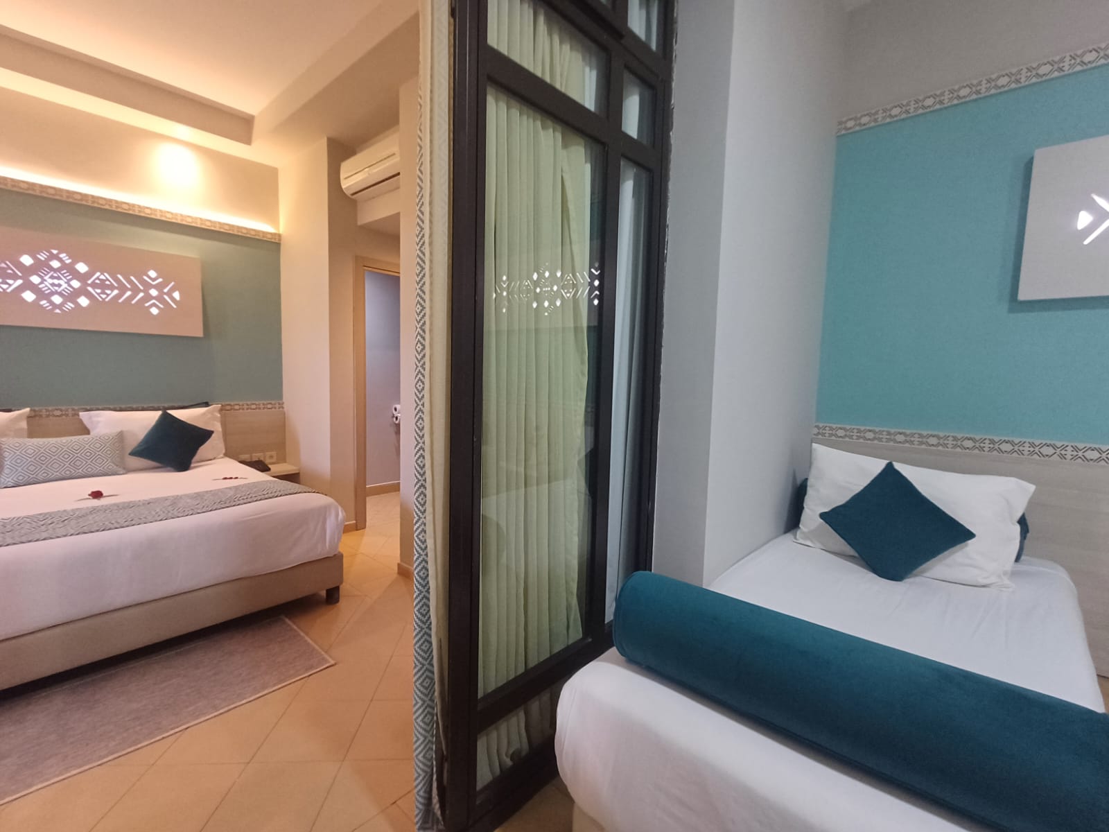 Décorée et agencée avec soin, cette chambre quadruple sans balcon est climatisée et dispose d'une salle de bain privée et de toilettes séparées, elle peut être à l'étage comme au rez-de-chaussée.